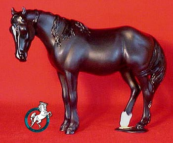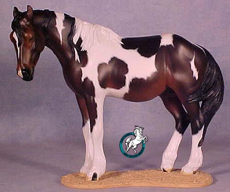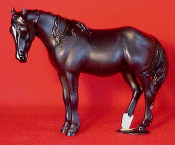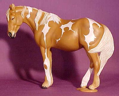 You can just picture this little mare out in a pasture somewhere dozing under a tree, dreaming of her soon-to-be-born foal. She stands with her eyes closed, lower lip drooping just a little, ears out to the sides in a neutral position and resting one hind leg. She has the "feathery" lower legs and has the "natural" look of a broodmare out in pasture, including shaggy hair under her jaws, up the backs of her forelegs (to her elbows) and inside of her ears .