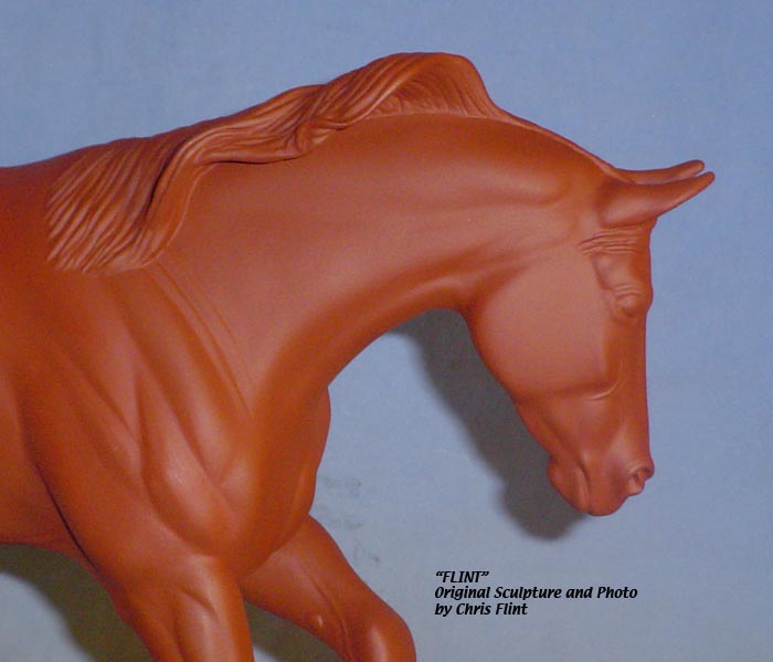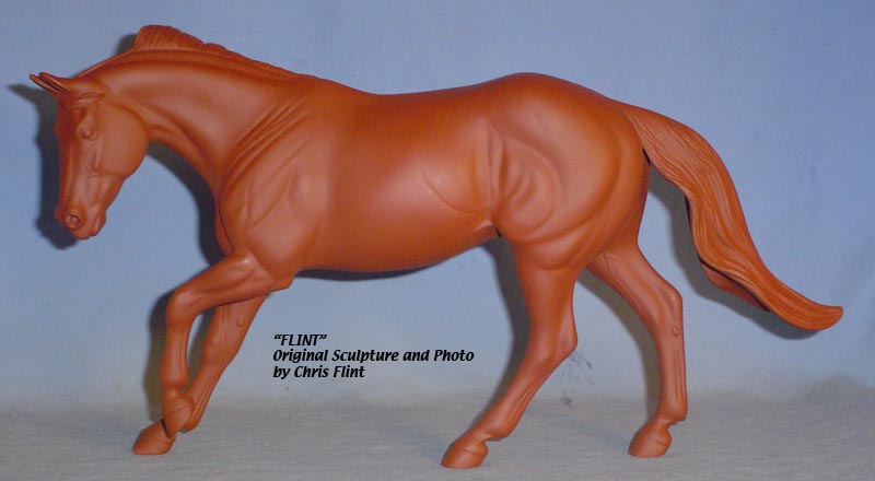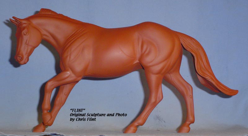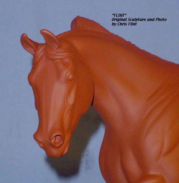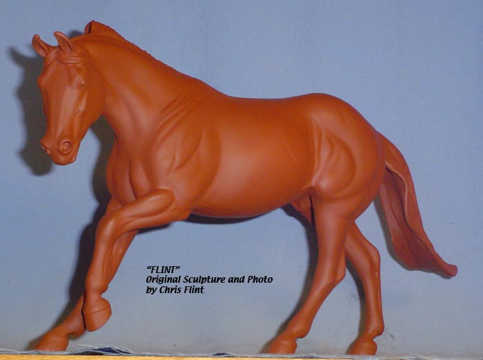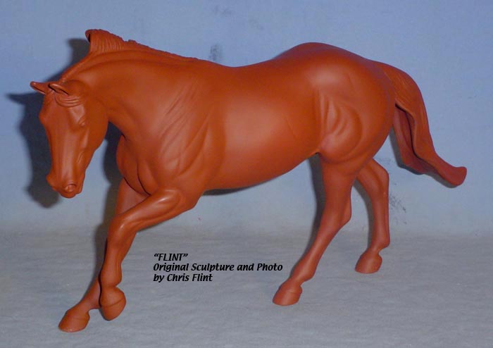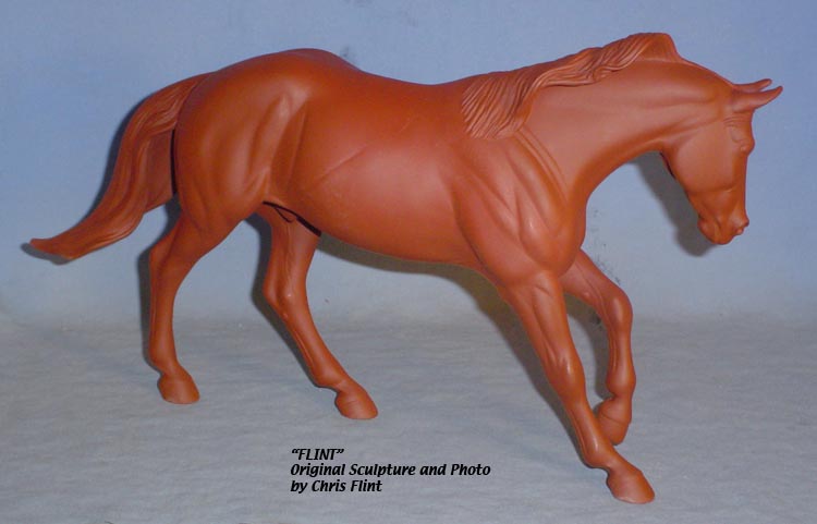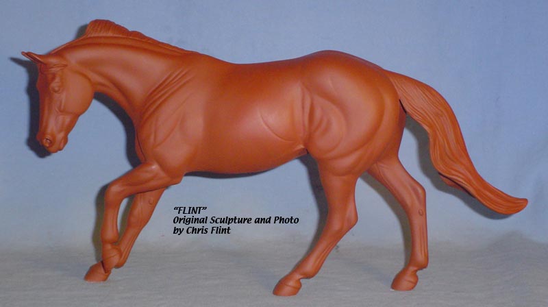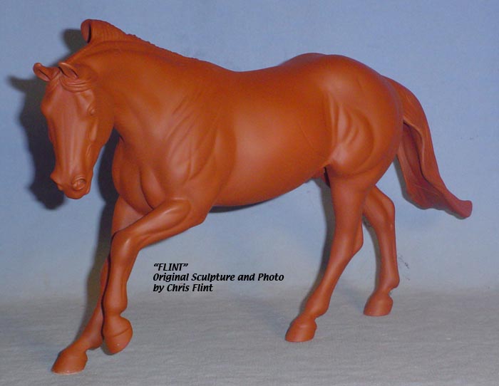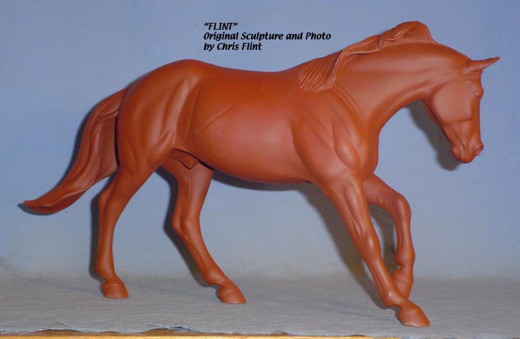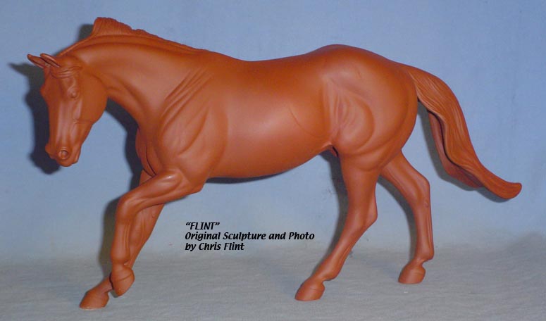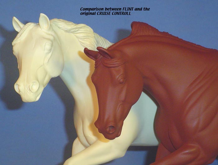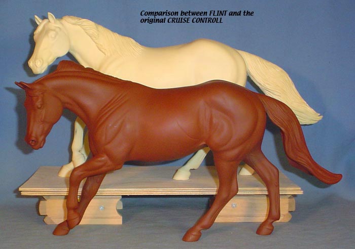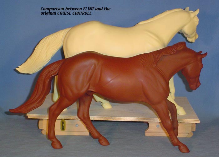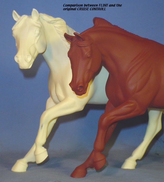 FLINT is 1/9th scale and is in the same position as the original Cruise Controll, but the similarites end there. He has a brand-new head, ears, mane and tail, shorter back and his entire body and legs have been re-muscled, refined and detailed. He measures approximately 6-3/8 inches at the ear tips, 7-1/4 inches at the highest point of the mane, 6-3/4 inches at the withers and is 13 inches long. Because he is a stock horse, he looks wonderful in any color you choose!