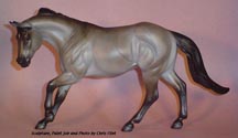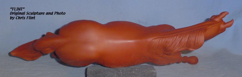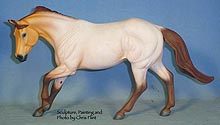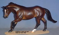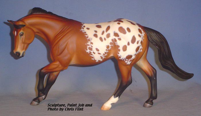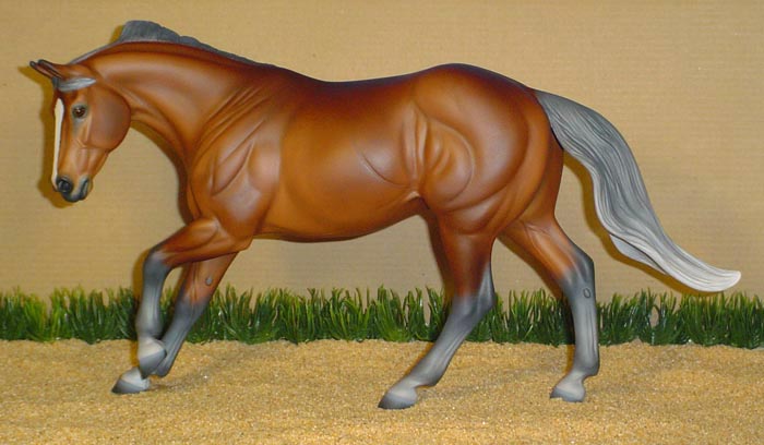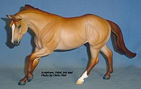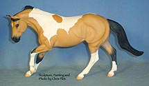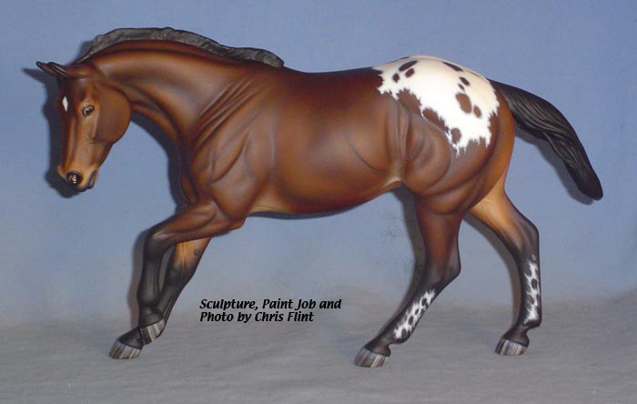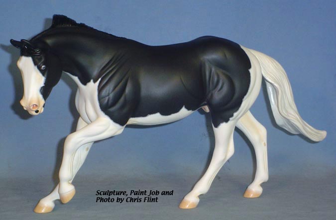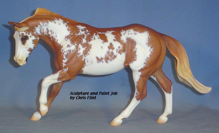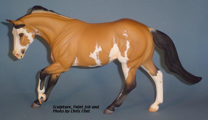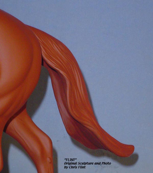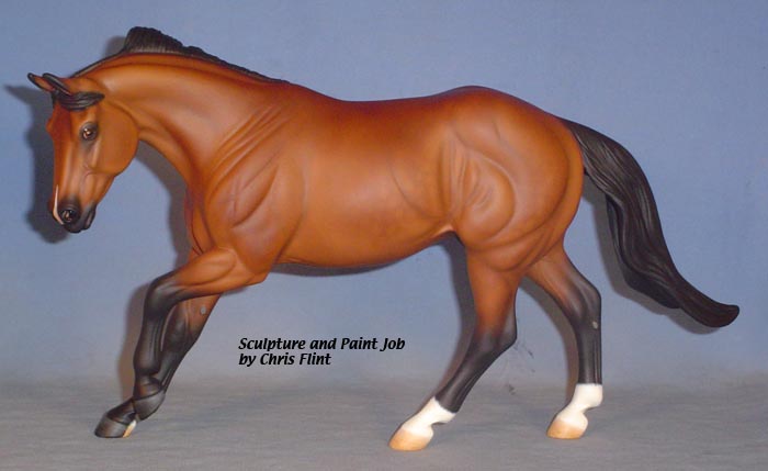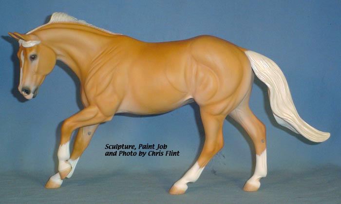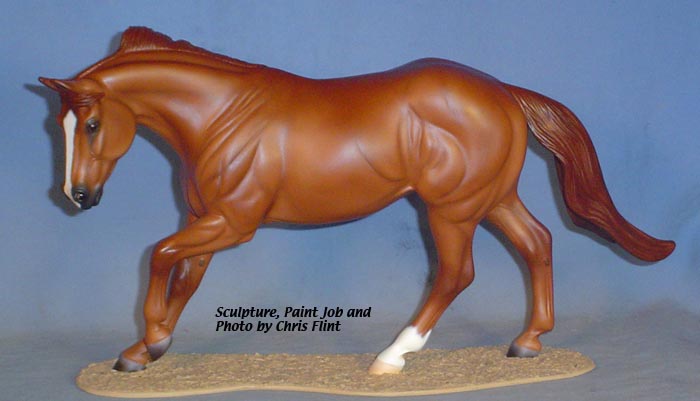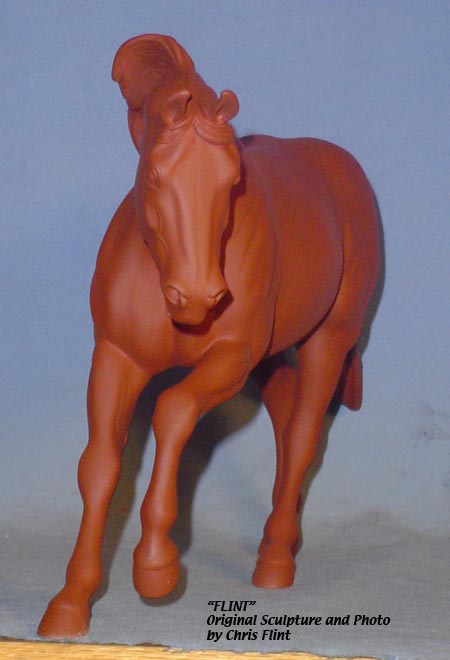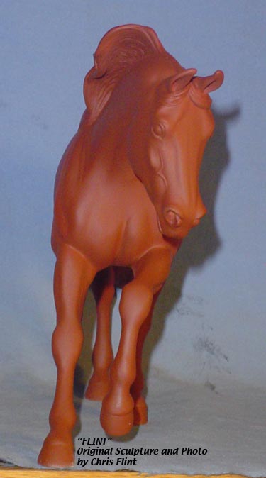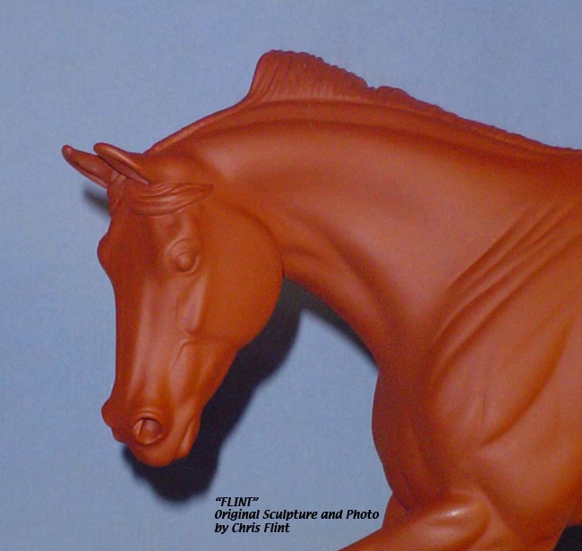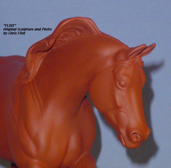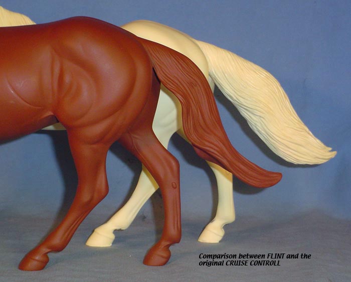 FLINT is 1/9th scale and is in the same position as the original Cruise Controll, but the similarites end there. He has a brand-new head, ears, mane and tail, shorter back and his entire body and legs have been re-muscled, refined and detailed. He measures approximately 6-3/8 inches at the ear tips, 7-1/4 inches at the highest point of the mane, 6-3/4 inches at the withers and is 13 inches long. Because he is a stock horse, he looks wonderful in any color you choose!