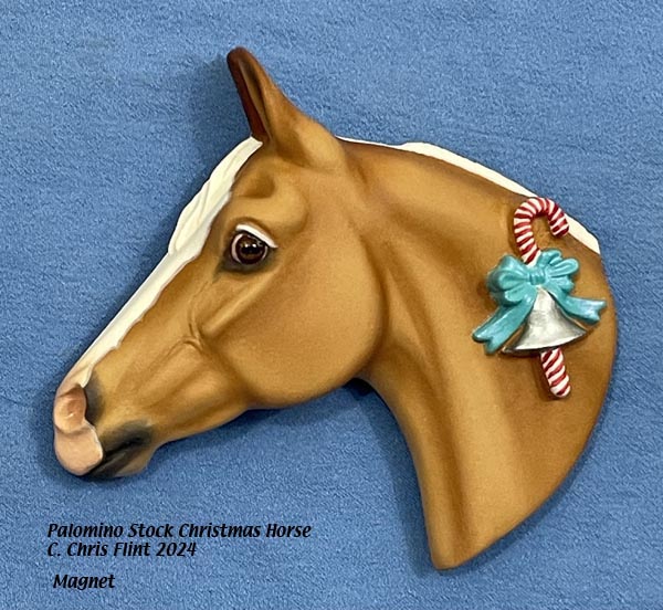 Palomino Stock Christmas Horse Christmas themed Project Pony painted in Palomino with silver bell and a pearly turquoise bow. Measures about 3-1/2 x 3-1/2 inches. Magnets on the back for display on any metal surface. $65.00 PPD Email Chris