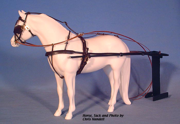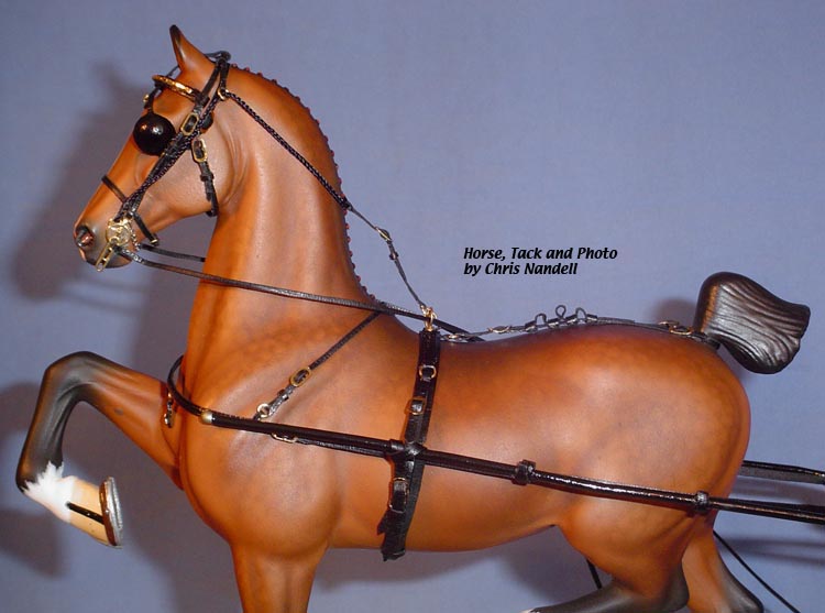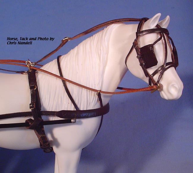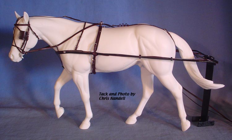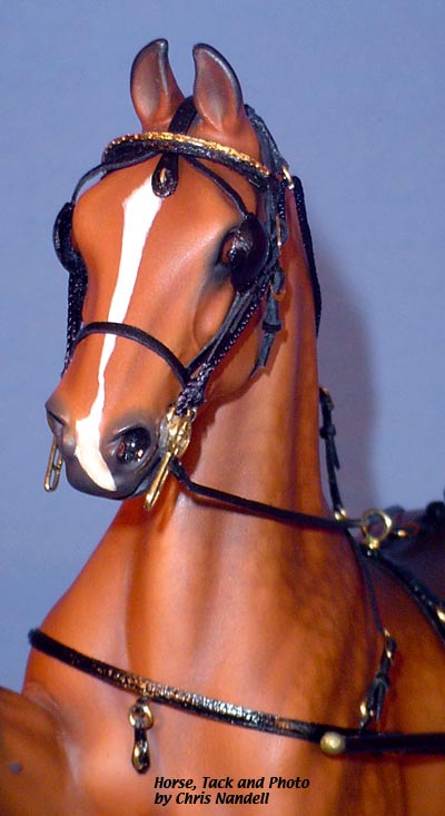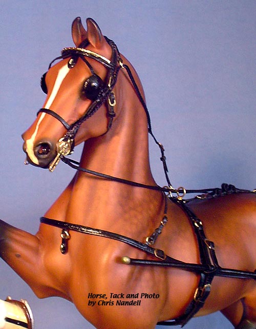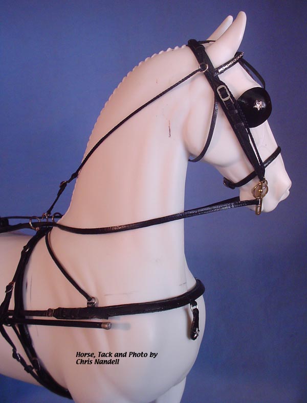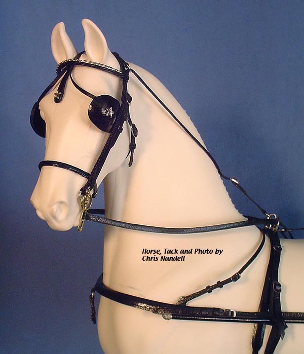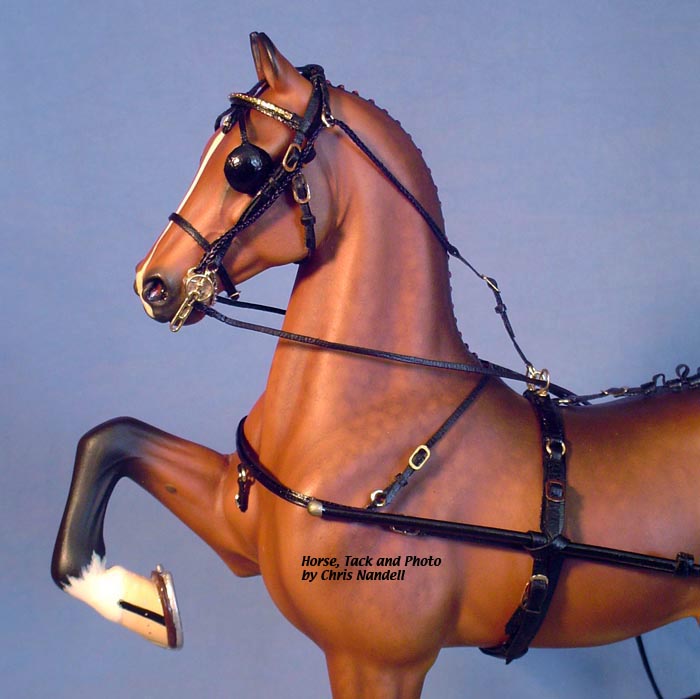 Completed January 11, 2009 I've been a little surprised and frustrated that I have not seen anyone showing any of my Hackney sculptures in Fine Harness! So I decided to make one and start showing them myself. This is a replica of a fine harness that I own. It features round, contoured blinkers, two bits (Liverpool and Bridoon) with curb chain on Liverpool, side checks and simulated patent leather blinkers, brow band, cavesson nose band, breast collar and saddle. Proudly shown off on my sculpture "Sophia", which will be released at some point in the future. I cant wait to show this set!
