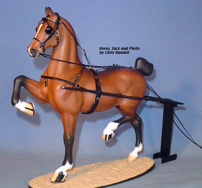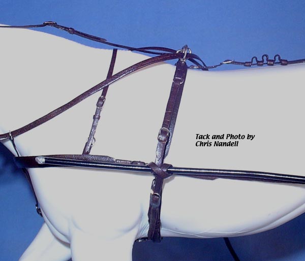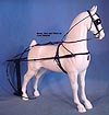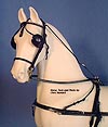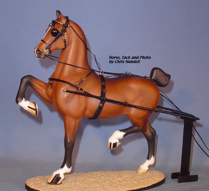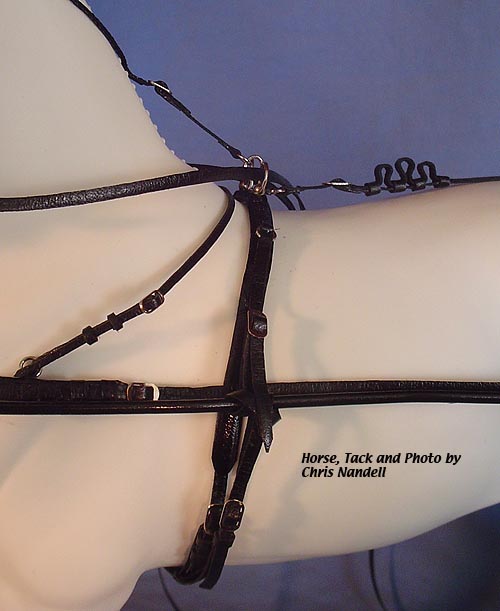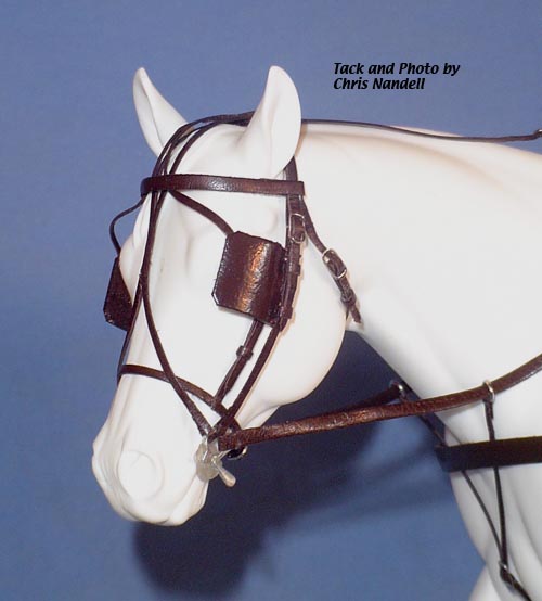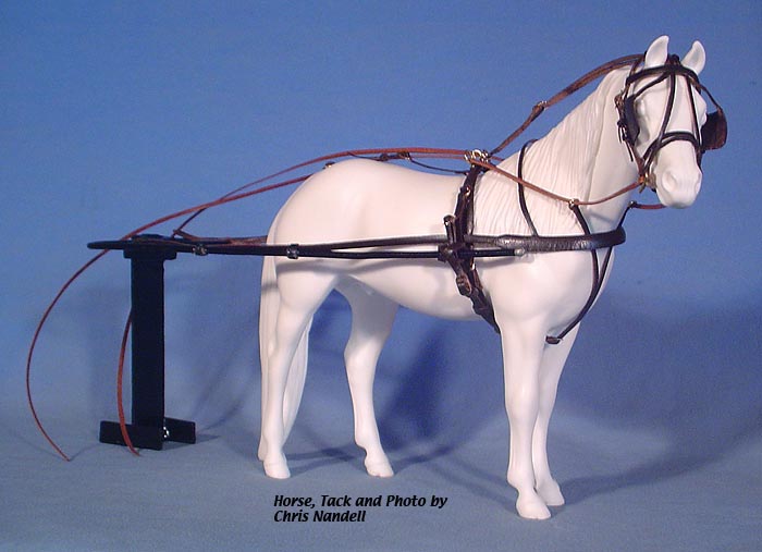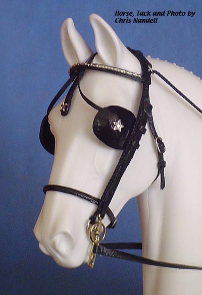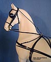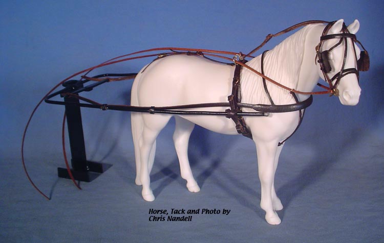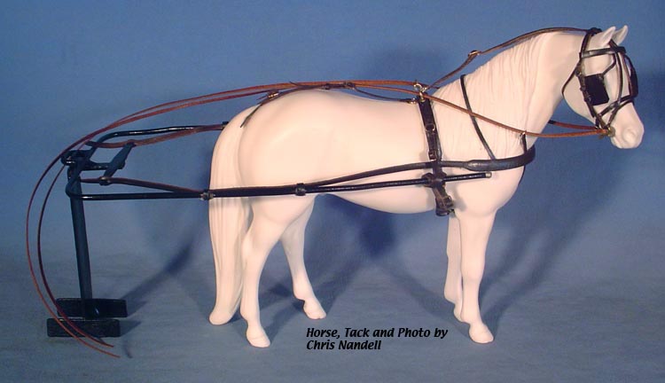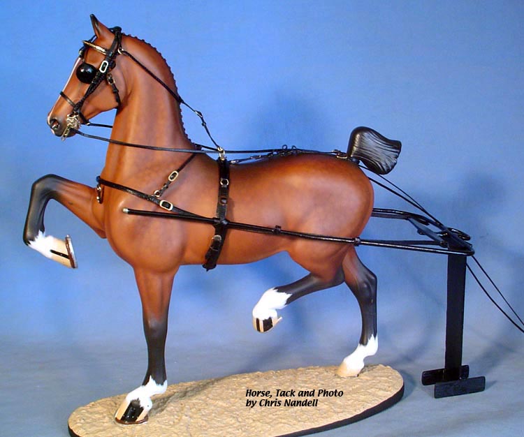 Completed January 11, 2009 I've been a little surprised and frustrated that I have not seen anyone showing any of my Hackney sculptures in Fine Harness! So I decided to make one and start showing them myself. This is a replica of a fine harness that I own. It features round, contoured blinkers, two bits (Liverpool and Bridoon) with curb chain on Liverpool, side checks and simulated patent leather blinkers, brow band, cavesson nose band, breast collar and saddle. Proudly shown off on my sculpture "Sophia", which will be released at some point in the future. I cant wait to show this set!