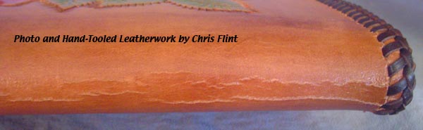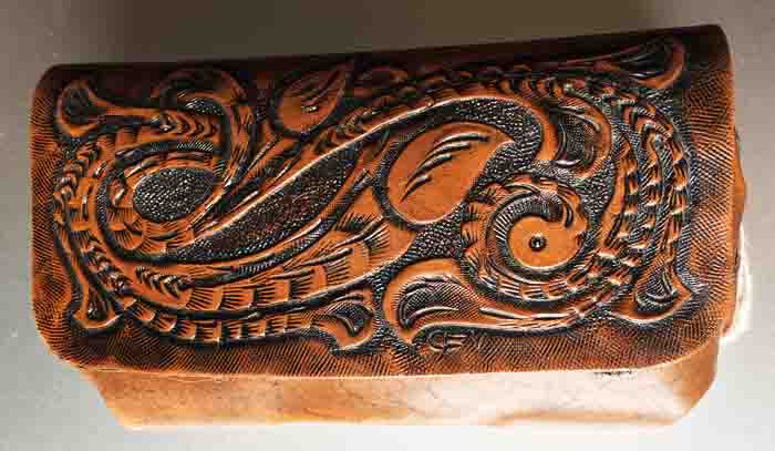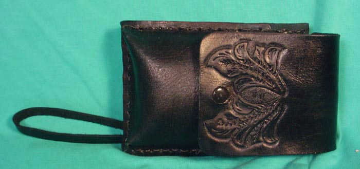 This simple little wallet has a tooled border and features Basket Weave Stamped design, (same on both sides), accentuated by Antique Saddle Tan stain. Dark brown double loop lacing all around the edge. (Synthetic Lace).