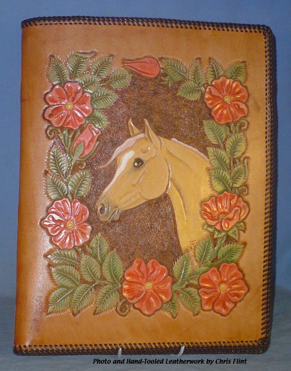 This is something that is definitely ONE of a kind! This is an OLD (30 years old!) Tandy Leather Kit. It features a beautiful Palomino horse head surrounded by Wild Roses all carved into the leather and then meticulously hand dyed in color.