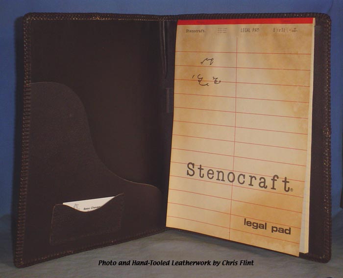 It holds a 9-1/2" x 11" pad of paper inside and has a a flap that can hold loose pages. There is also a pocket to hold business cards and a pencil/pen holder too. Folded in half it measures 10" x 13".