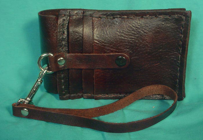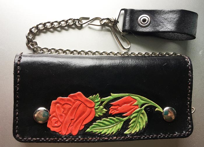 This GORGEOUS wallet will stay safely and securely on your person with the attached chain belt loop/clip end. Beautifully figure carved and color dyed, this is as much a work of art as a wallet!