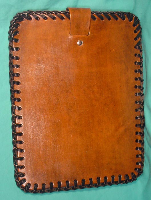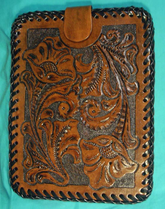 Protect your valuable small Tablet Computer with this beautiful Hand-Tooled Leather case. Dark Brown antique finish with velcro closure. Topped off with double-loop lacing (synthetic).