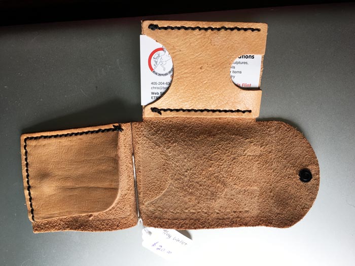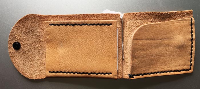 This is a simple wallet made of soft cowhide that's just right for a childs first wallet. Has a spring clip for folding money a pocket for ID and one for cards. Snap closure.