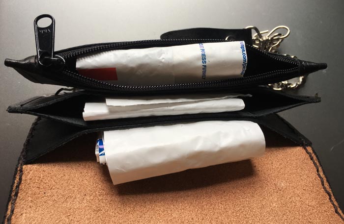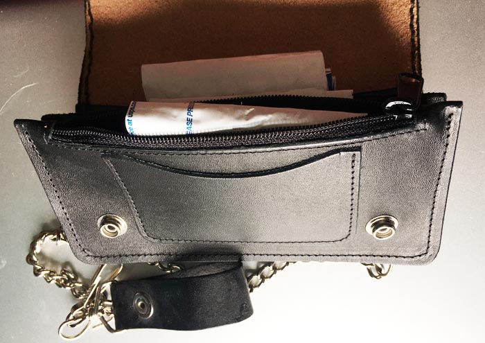 Inside there is a pocket for your paper bills, coins and one for your ID/Drivers' License, Business cards Heavy duty snaps keep it closed. It measures 7" x -1/2" with 12" chain.