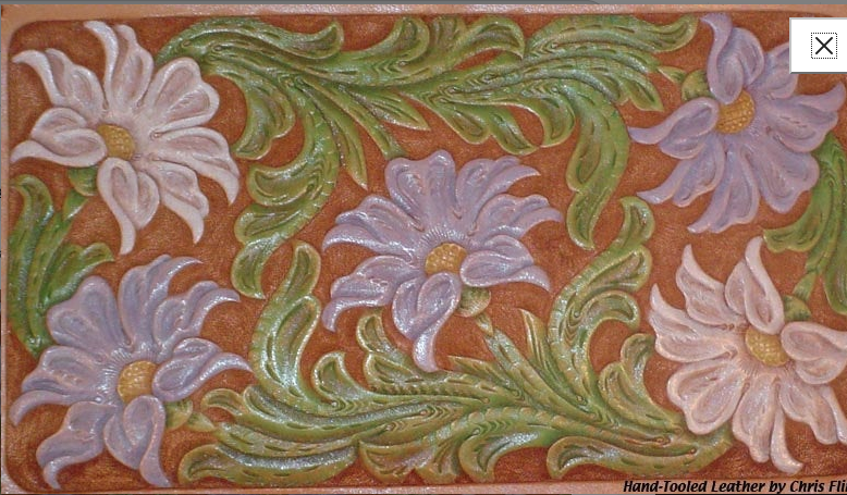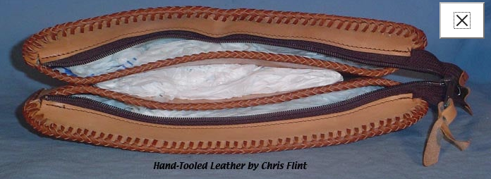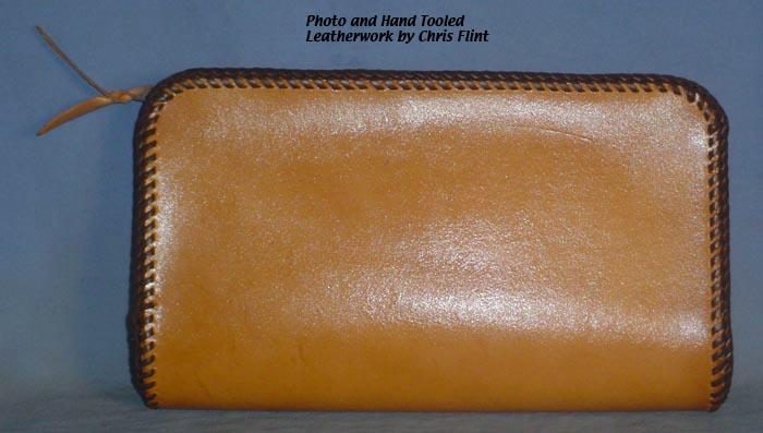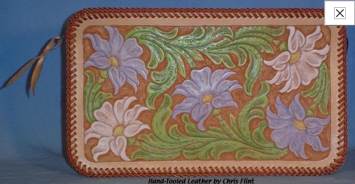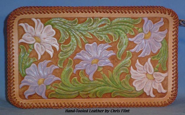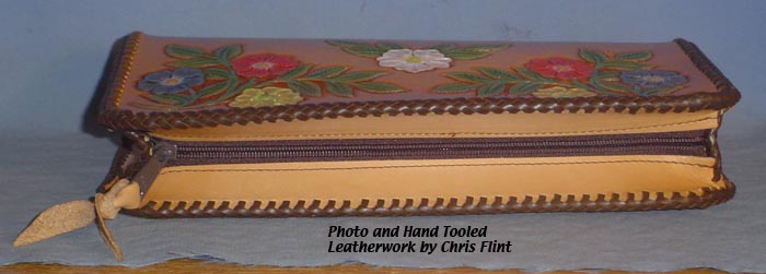 Flowered Clutch Purse #L035 $257.50 This beautiful hand-tooled leather purse features a beautiful bouquet of multi-colored flowers on a natural background. The back side of the purse is not tooled and there is a zipper across the top with a leather pull. Inside, it is fully lined with buttery soft golden beige pigskin suede. The entire piece is topped off with dark brown "double loop" lacing. There are no pockets or dividers inside, it's just an open clutch type purse, big enough to carry a wallet and checkbook and a few other small things inside. It measures 11-1/4" long by 6-1/2" tall and 2-1/4" wide. | ||
