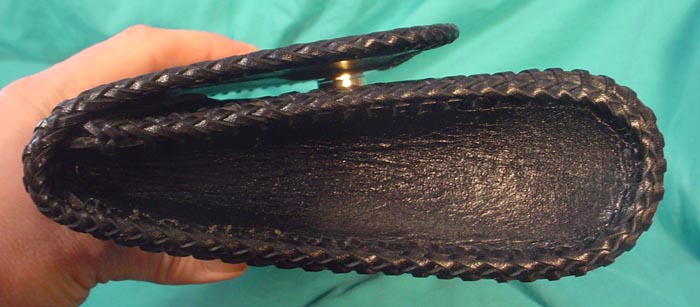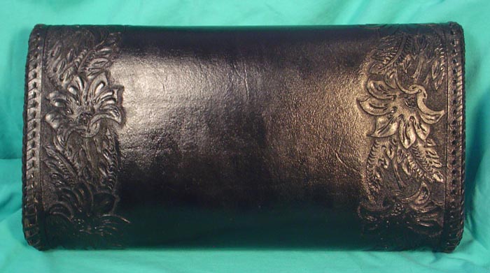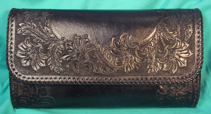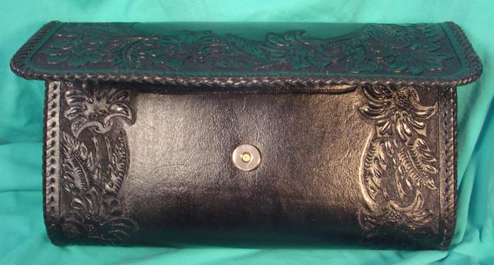 Black Clutch Purse #L079- $309.00 Completely hand-tooled and fully lined with smooth black pigskin. It closes with a gold-toned magnetic catch and is topped off with black double-loop lased edges for the perfect finishing touch. Has a durable finish to help keep it shiny and looking good for years and years! Bag measures 11-1/2" wide x 6-1/4" tall x 2" deep. So it's perfect to carry under your arm! This wonderful bag should last a lifetime! | |||