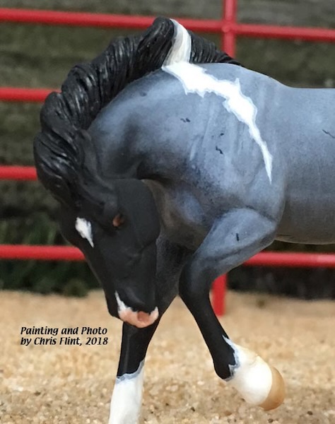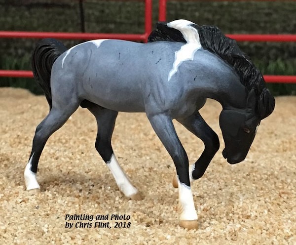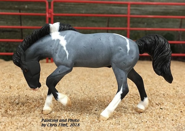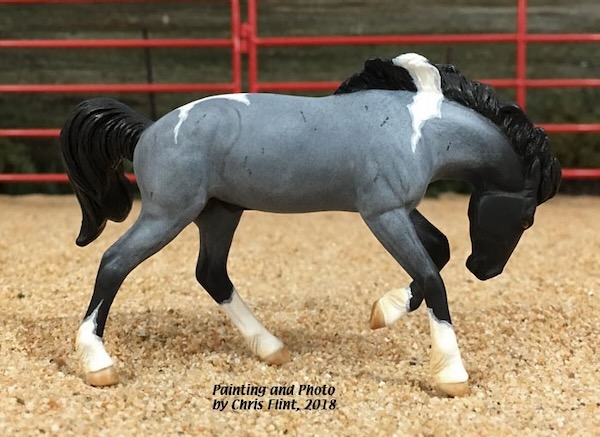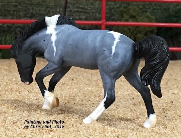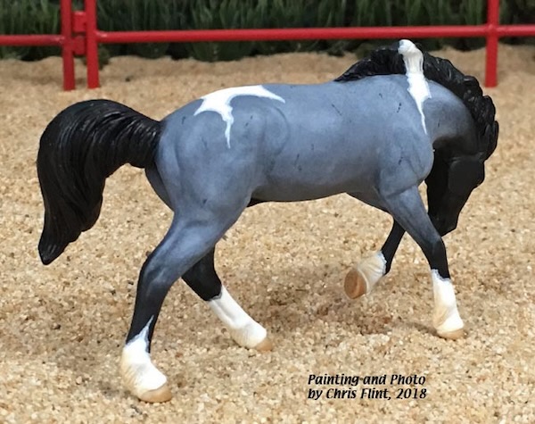 This is a simple custom on the Breyer SM "Rivet". I painted this guy blue roan with scratches and corn marks in OILS and topped it off with some simple, fully mapped, pinto markings.