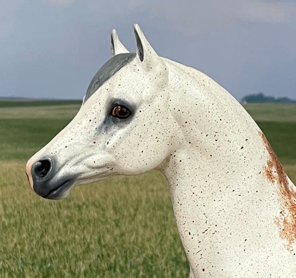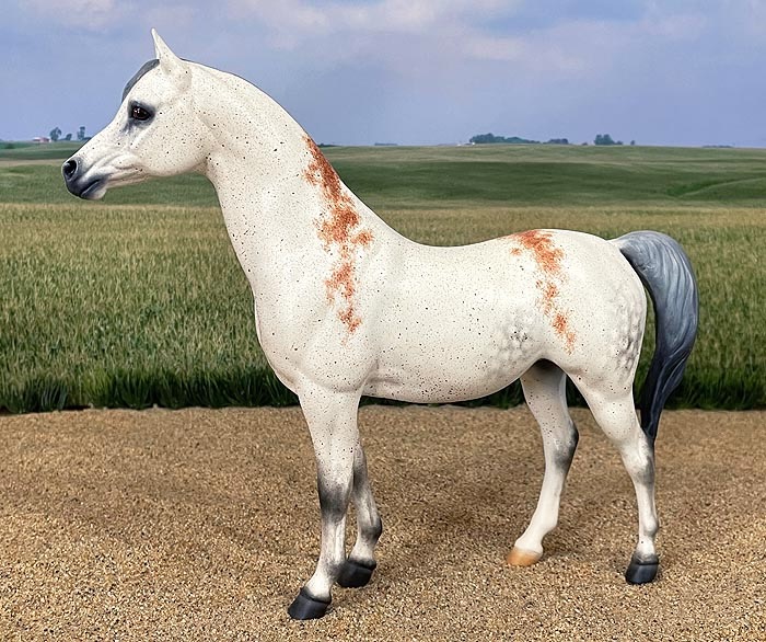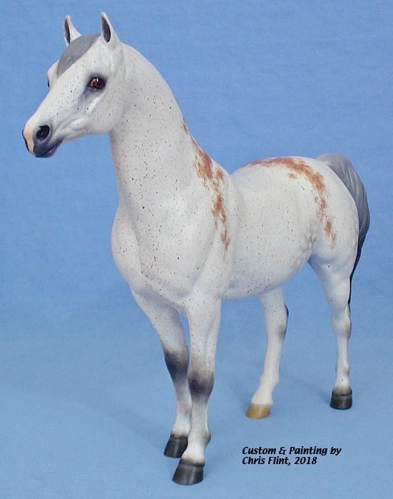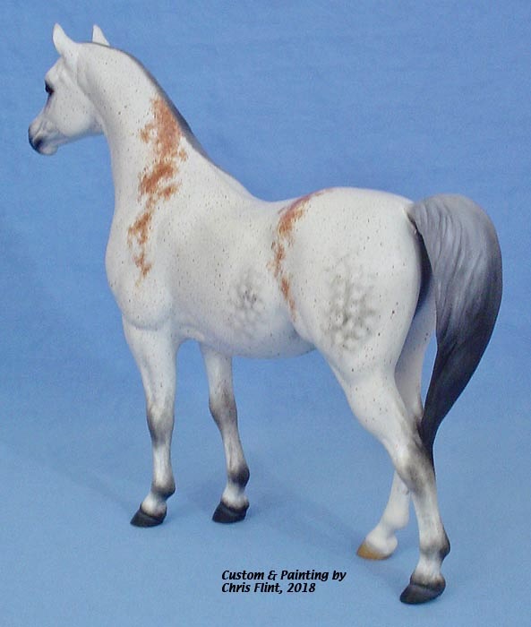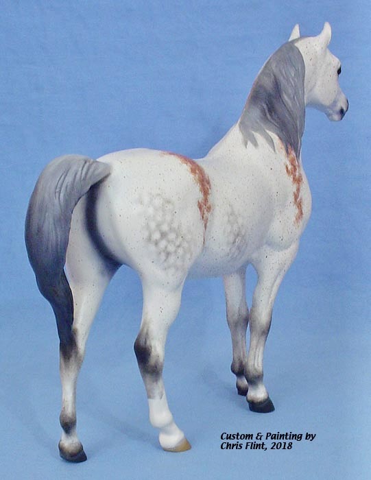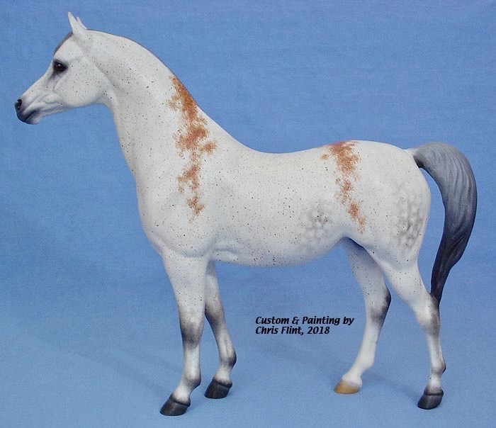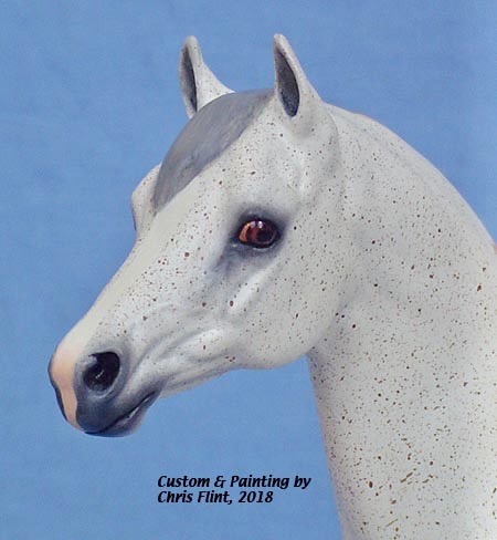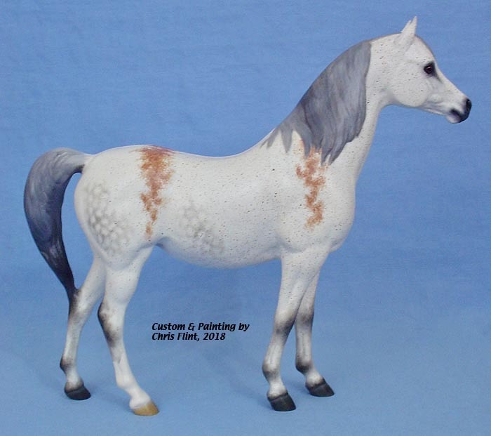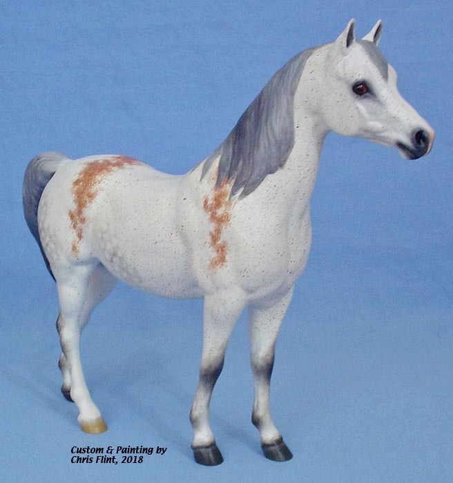 This is a simple Custom of a Breyer Traditional Proud Arabian Mare. This beauty was meticulously prepped and is painted Flea-Bitten grey with Blood markings and some dappling in Oils and Acrylics. Her ear tips, nostril
